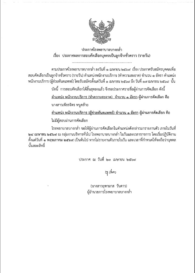 ประกาศผลการสอบคัดเลือกบุคคลเป็นลูกจ้างชั่วคราว (รายวัน) ตำแหน่งพนักงานบริการ (ทำความสะอาด) จำนวน ๑ อัตรา ตำแหน่ง พนักงานบริการ (ผู้ช่วยหันตแพทย์)